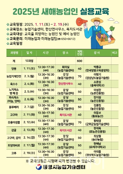 [더코리아저널 경남취재본부 최태희 기자] 통영시는 오는 11일부터 2월 19일까지 농업인, 귀농인, 예비 농업인 600여 명을 대상으로 ‘2025 새해농업인실용교육’을 추진한다고 밝혔다.