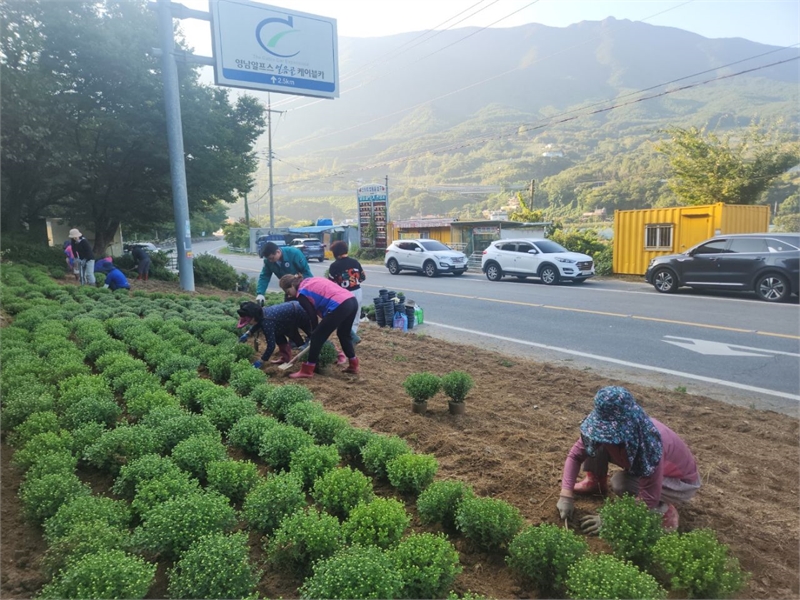 이번 식재에는 산내면 생활개선회 회원 20여 명이 참여해 얼음골 입구, 얼음골 교차로, 남명삼거리와 주요 도로변 화단과 화분 등에 국화를 심어 산내면의 가을 정취를 더했다.