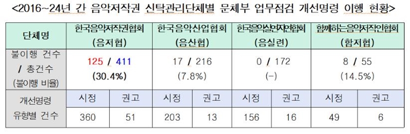 문체부는 개선명령 유형에 따라 ‘시정사항’은 6개월 내 완료 후 보고, ‘권고사항’은 6개월 내 추진 계획 수립을 단체들에게 요구하고 있다. 음저협은 타 단체들에 비해 문체부 개선명령을 제대로 지키지 않은 건수가 훨씬 많았다.