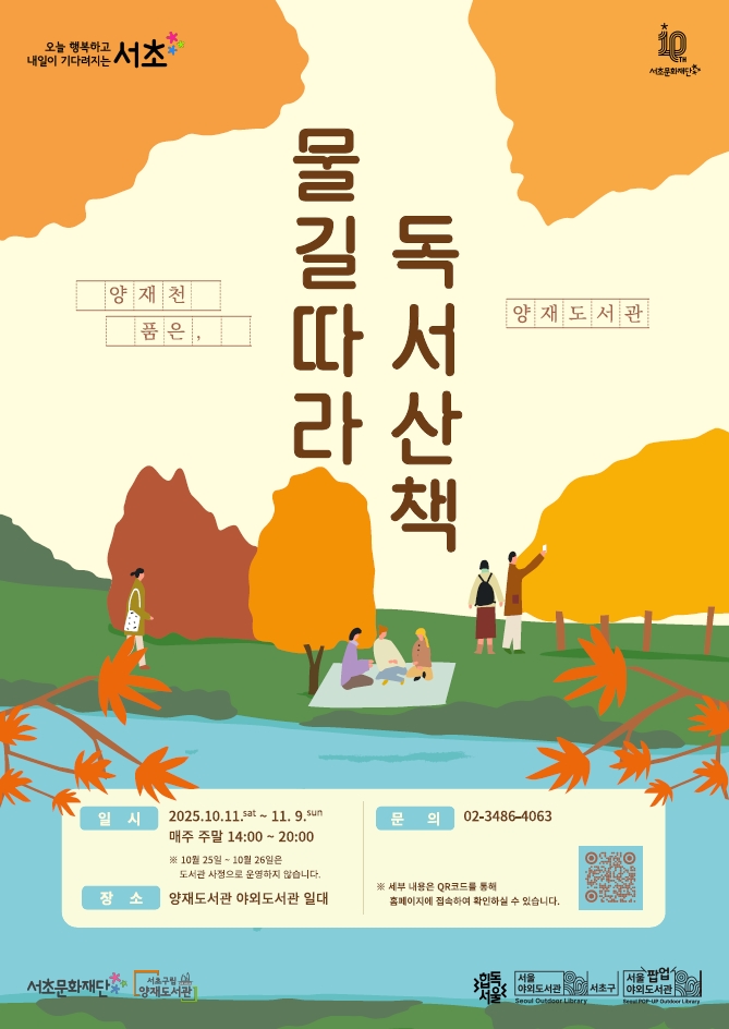 서초구립양재도서관은 오는 11일부터 11월 9일까지 매주 토, 일요일에 ‘오솔숲 야외도서관’과 양재천변에서 「양재천 품은 양재도서관」을 운영한다고 밝혔다.