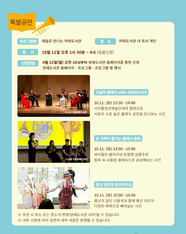 특히 첫날인 11일 오후 1시 30분부터 5시까지는 ‘양재천 품은 양재도서관’의 개관을 알리는 행사가 열린다. 서리풀청년예술단 ‘서초M스타즈’의 클래식 공연을 시작으로 해금·바이올린·건반이 어우러진 일미터 클래식 3중주 등 축하공연이 이어질 예정이다.