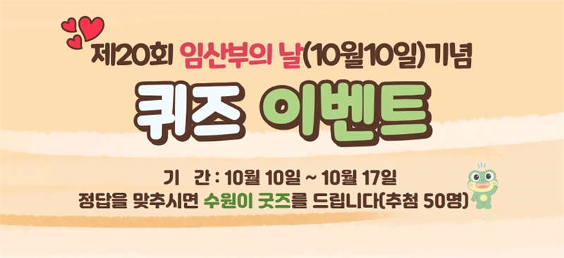 장안구보건소는 10월 10일부터 17일까지 모자보건실과 온라인 플랫폼 ‘새빛톡톡’을 통해 임신·출산·육아 관련 퀴즈 이벤트를 진행한다. 정답을 맞힌 시민 중 일부를 추첨해 기념품을 증정한다.