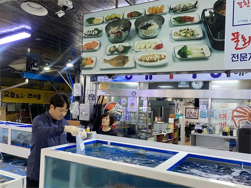 포항시 식음료 사전점검반이 수산물, 수족관수, 조리식품 등 유통 식품의 안전관리를 위해 수거·검사에 나섰다 [사진=포항시]
