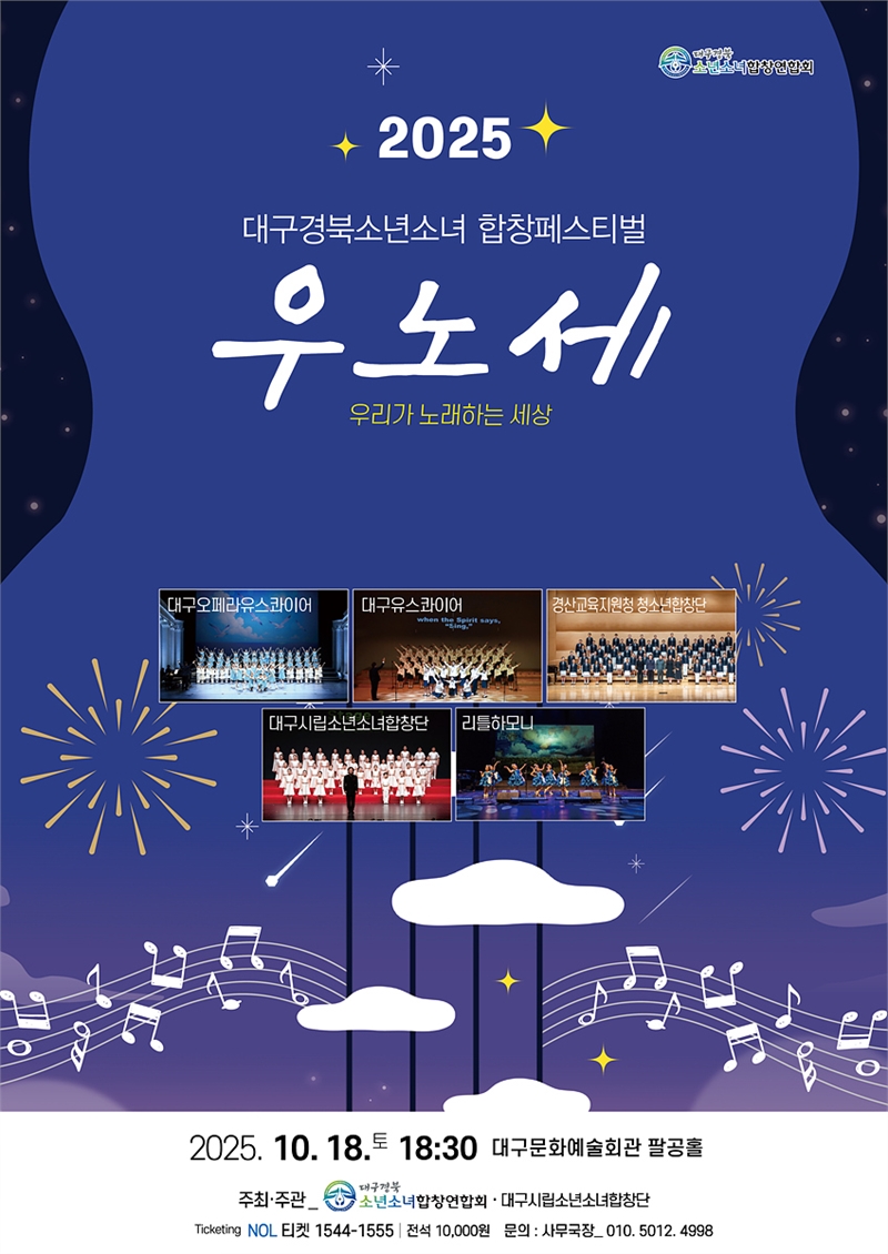 이번 합창제에는 대구시립소년소녀합창단, 대구유스콰이어, 경산교육지원청 청소년합창단, 리틀하모니, 대구오페라유스콰이어가 참여해 다채로우면서도 조화된 무대를 선보인다.