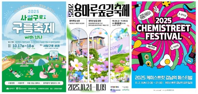 좌측부터 사일구로 구름축제, 용마루숲길 축제, 케미스트릿 강남역 포스터 [사진=서울시]