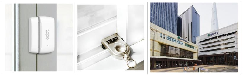 좌측무터 문열림 감지장치, 창문잠금장치 모습, 우측은 구청 전경 [사진=송파구청]