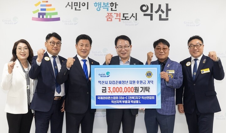 이날 국제라이온스협회 356-C(전북)지구 박성춘 지구총재, 박삼열 익산지역 부총재는 시청을 방문해 자립준비청년을 위한 후원금 300만원을 전달했다.
