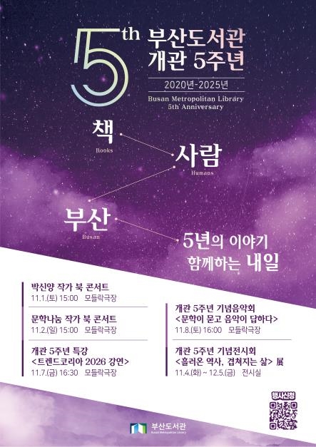 [더코리아저널 김종섭 기자] 부산도서관(이하 도서관)은 2020년 11월 개관 이후 5주년을 맞아, 오는 11월 한 달간 「부산도서관 개관 5주년 기념행사」를 개최한다.