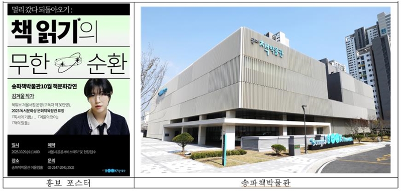 [더코리아저널 전영순기자] 독서의 계절 가을을 맞아, 송파구(구청장 서강석)가 오는 29일 오후 2시 송파책박물관에서 ‘북튜버(BOOK과 유튜버의 합성어)’ 김겨울 작가를 초청한 책문화 강연을 개최한다.