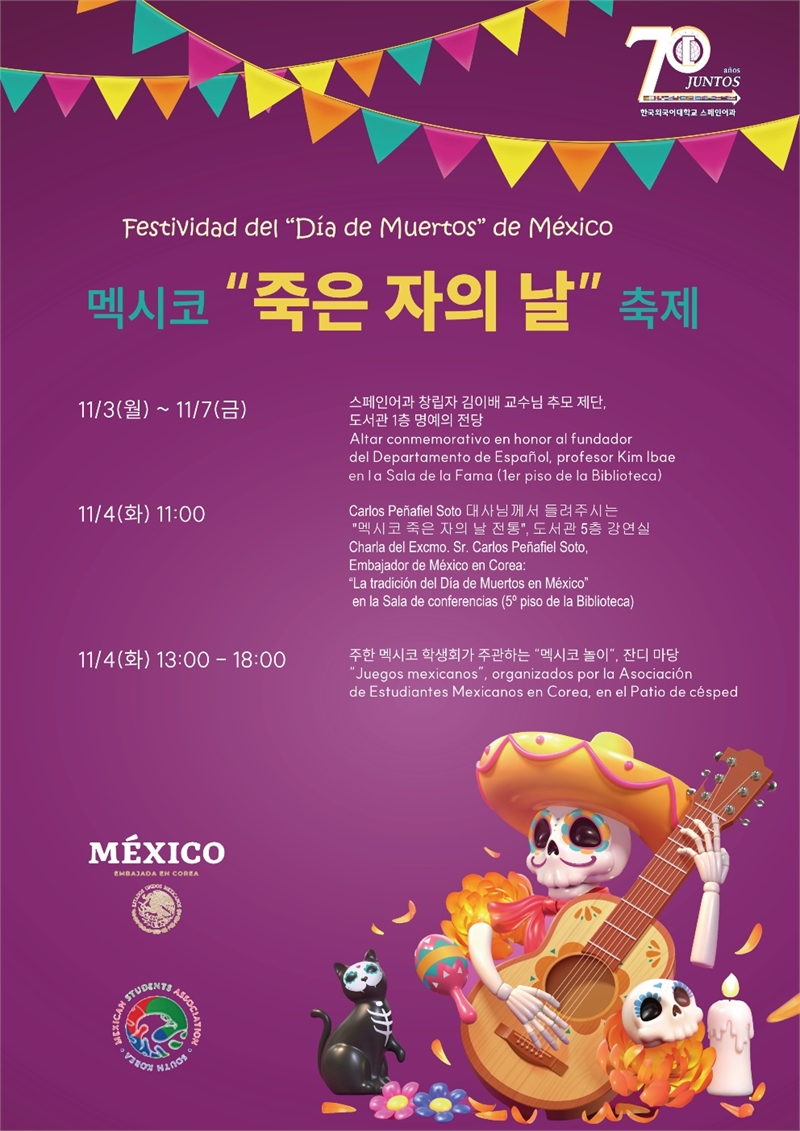 먼저 ‘죽은 자의 날(Día de Muertos)’ 멕시코 축제를 필두로, 고 김이배 교수 추모 제단을 설치하고 고인을 기리고 있다. ‘故 김이배 회고전’은 스페인어과 창립자이자 한국외대의 초석을 놓은 김이배 교수의 삶과 철학을 조명하는 행사다. 카를로스 페냐피엘 소토 주한 멕시코 대사의 특별 강연과 멕시코 전통놀이 행사가 진행된다.