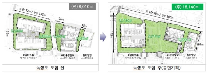 시는 그동안 녹지생태도심의 일환으로 흩어져 있던 개별지구 녹지가 ‘하나의 정원’으로 실현될 수 있도록 ‘도심 녹지공간 통합조성계획’을 추진, 서소문빌딩 재개발 사업의 녹지형 개방 공간(보행로 포함)을 당초 8,010㎡에서 226% 늘어난 18,140㎡까지 확보했다.