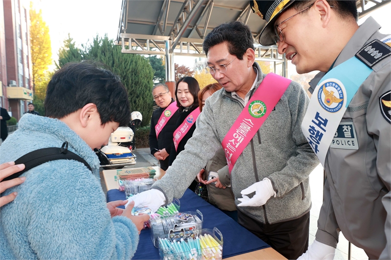 이 시장은 캠페인 참여자들을 격려하고 아이들과 시민에게 교통안전 홍보물품을 전달하며, 스쿨존 내 어린이 교통사고 제로를 위한 교통안전수칙을 당부했다.