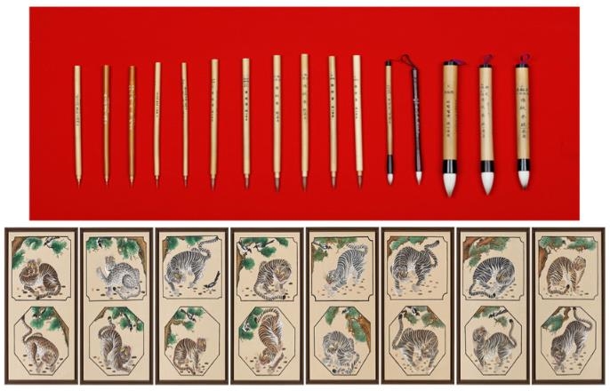 상단은 황모필장 정혜창 보유자 작품 “민단청 바림질 붓”, 하단은 민화장 정귀자 보유자 작품 “군호도” [사진=서울시]