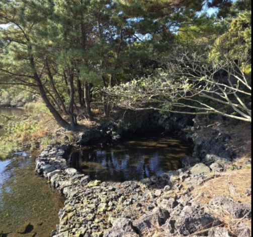 물이 근원지쪽으로 걸어가면 물이 갈래져 내려오는 것을 양쪽으로 볼 수 있다. 이 용천수인 탕탕물에서 10여분 올라가면 명법사란 절이 있는데 그 입구에서도 물이 힘차게 내려오고 있었다.