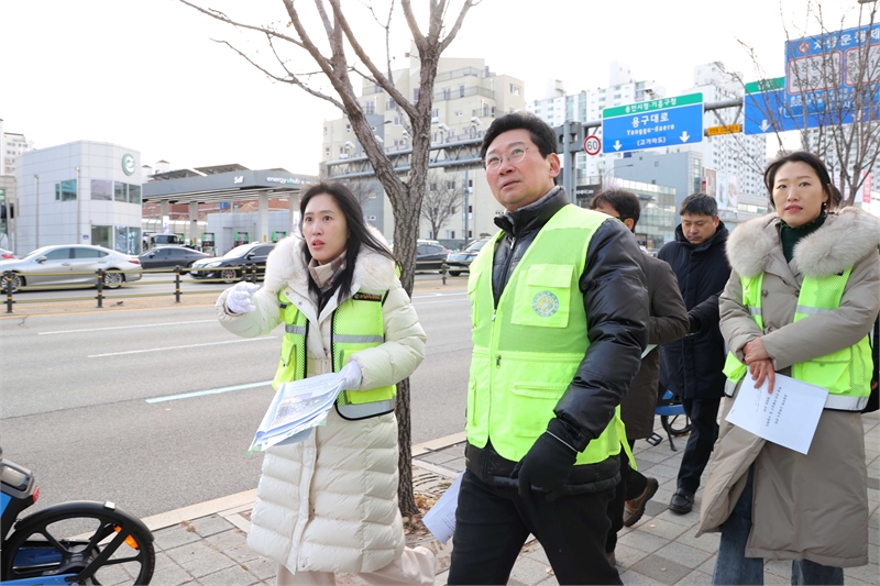 이 시장은 학생들이 횡단보도를 안전하게 건널 수 있도록 교통 지도를 하며 봉사자들을 격려했다. 교통 봉사 후에는 학부모들과 함께 학교 주변을 둘러보며 통학로 불편 사항을 청취했다.