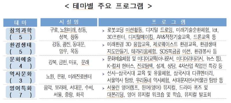 이번 캠프에서는 ▲창의과학 ▲환경생태 ▲문화예술 ▲역사문화 ▲영어특화 등 5개 테마를 중심으로 330여 개의 다채로운 활동이 진행된다.