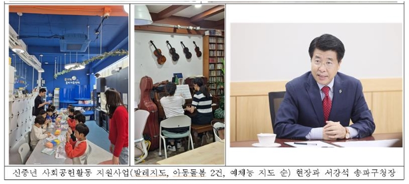 송파구가 2021년부터 추진 중인 ‘신중년 사회공헌활동 지원사업’은 50세 이상 70세 미만의 신중년이 퇴직 이후에도 전문성과 경력을 살려 사회공헌활동을 할 수 있도록 지원하는 사업이다. 지역 내 각종 기관과 단체에서 발레, 축구, 드론, 아동돌봄, 스포츠지도사, 서가정리·도서관리 등 다양한 분야의 활동 기회를 제공한다.