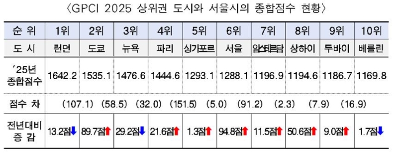 [더코리아저널 전영순 기자] 서울시가 일본 모리기념재단 도시전략연구소가 발표한「세계 도시 종합경쟁력 지수(GPCI, Global Power City Index)」에서 10위권 도시 중 가장 높은 점수 상승을 보이며 작년에 이어 세계 6위를 유지했다.