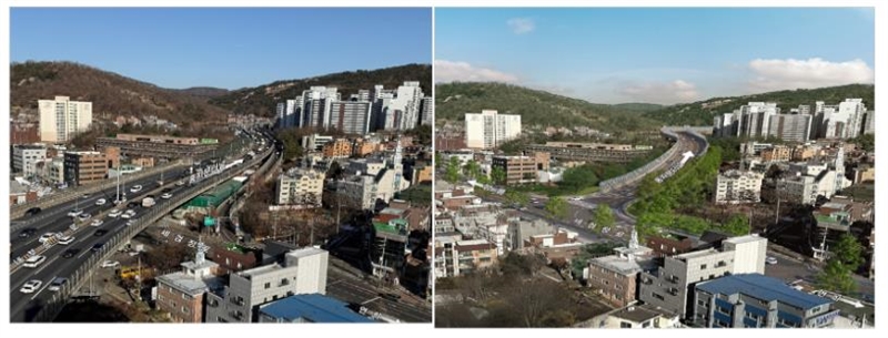 시행 전(좌측), 후(우측) 홍은IC(홍지문 터널 입구) [사진=서울시]
