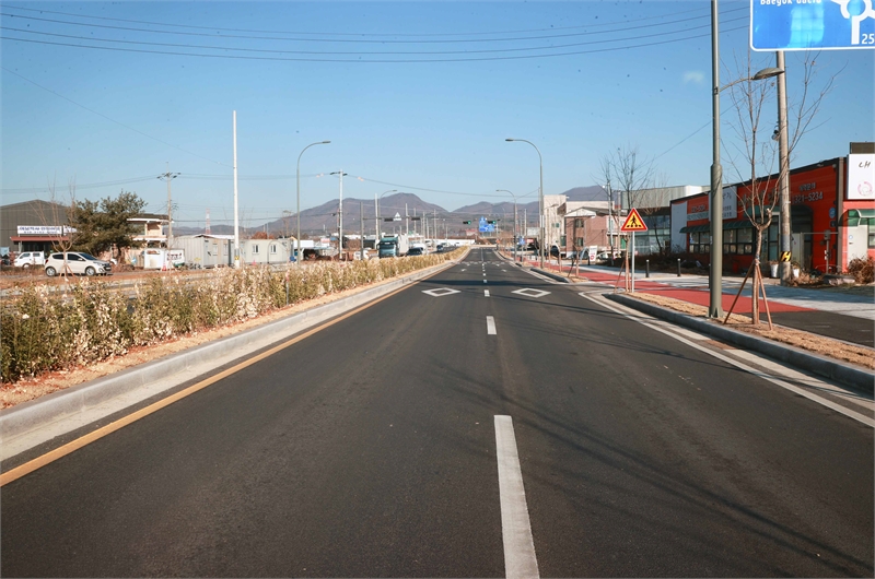 송전리 774번지 일원 송전입구 도로확장 사업(대1-1호)은 2022년 4월 공사를 시작해 올해 11월 21일 마무리됐다. 시는 총 110억원(설계 2억원·보상비 48억원·공사비 60억원)을 들여 송전2교에서 ‘국지도82호선’까지 길이 580m 도로를 왕복 2차선에서 4차로로 확장했다.
