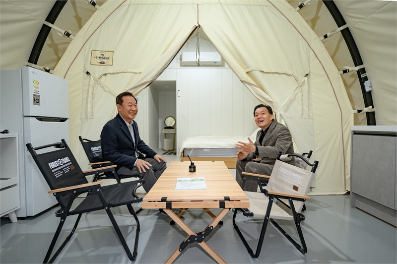 10월 22일 열린 청량산 수원캠핑장 개장식 후 이재준 시장(오른쪽)과 박현국 봉화군수가 글램핑 시설을 살펴보고 있다. [사진=수원시]