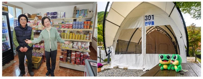 청량산 수원캠핑장 인근에서 마트를 운영하는 임광선(오른쪽)씨 부부, 우측은 캠핑장 시설 [사진=수원시]