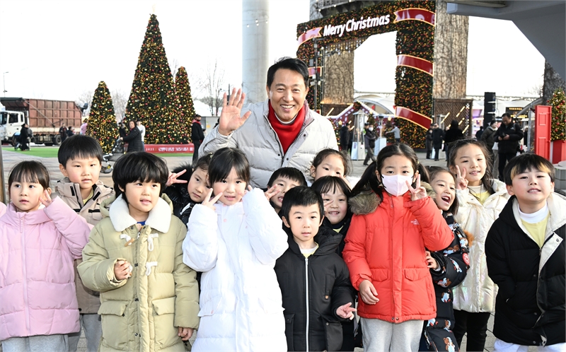 오세훈 시장이 24일(수) 광진구 청담대교 하부 일원에서 열린 '2025 로맨틱한강 크리스마스 마켓'에서 어린이들과 기념촬영하고 있다. [사진=서울시]
