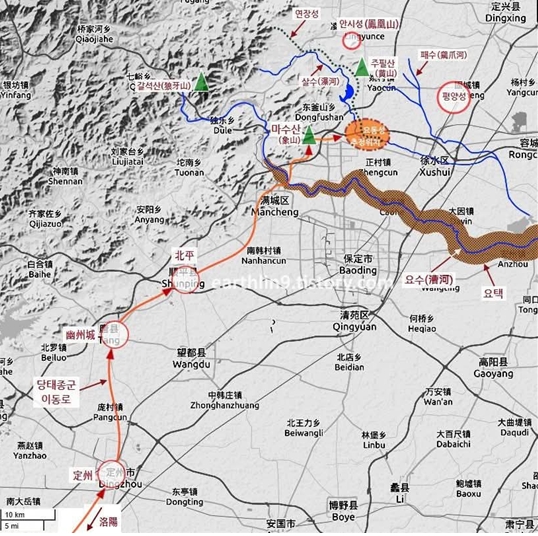 이세민이 건넜다는 요수는 요령성 '요하'가 아니고 하북성 조하이다(지금 만성구 서수). 한나라때 요수는 지금 보정시 역현의 남역수(南易水)이지만 수,당대에는 남역수의 서남쪽 15킬로 지점에 있는 만성구(滿城區) 북쪽을 흐르는 조하(漕河), 혹은 서수(徐水)를 요수라고 불렀다. 유성과 함께 그 위치가 옮겨졌다. 지도 서북쪽에 짙은 색이 태행산맥의 산악지대를 표시한다.