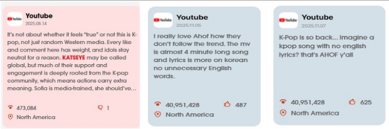 [그림 1] AI 기반 한류 빅데이터 대시보드 ‘원문 분석’ 내 캣츠아이(좌)와 아홉(우)을 통한 케이팝 정체성에 대한 논의(출처: 한국국제문화교류진흥원)
