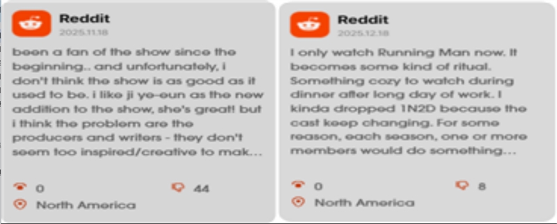 2025년에도 《SBS》의 장수 예능 <런닝맨>은 버라이어티 부문 상위 키워드를 유지하며 글로벌 인지도를 이어간 것으로 나타났다. 다만 프로그램 포맷 변화에 대한 아쉬움과 반복성에서 비롯된 피로감이 함께 제기됐다. 9월 1일 기준 ‘원문 분석’ 결과, 해외 시청자들은 <런닝맨> 초창기의 신체적 도전과 즉각적인 유머를 프로그램의 핵심 정체성으로 기억하고 있으며, 최근 회차에서는 이러한 요소가 약화됐다고 평가했다. 이 같은 인식은 데이터에서도 확인됐다. 2025년 8~9월 ‘트렌드 감성 분석’에 따르면, <런닝맨>의 언급량은 상위 키워드 내에서 점진적인 감소 추세를 보였다. 그럼에도 글로벌 시청자들은 시청을 중단하기보다는, 변화의 방향을 두고 지속적으로 의견을 나누며 비판과 애착이 공존하는 방식으로 콘텐츠를 소비하는 모습을 보였다. 이는 장기 콘텐츠가 온라인 담론 속에서 재해석·재구성되며 생명력을 유지하는 방식을 보여준다.