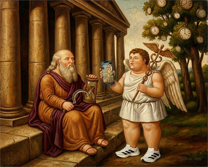그림1. 크로노스와 요즘 젊은 카이로스의 시간, Generated AI, 2026, 이홍석