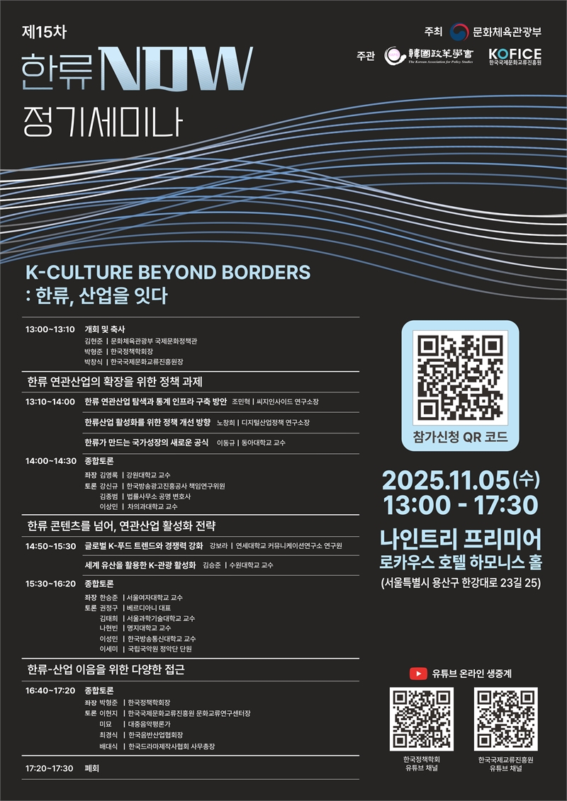 [더코리아저널 최은화 기자] 다양한 산업의 경계를 넘나드는 K-컬처의 또 다른 도약을 모색하는 논의의 자리가 마련됐다. 문화체육관광부(장관 최휘영, 이하 문체부)가 주최하고 한국국제문화교류진흥원(원장 박창식, 이하 진흥원)과 한국정책학회(학회장 박형준)가 공동주관하는 ‘제15차 한류NOW 정기세미나’가 오는 11월 5일(