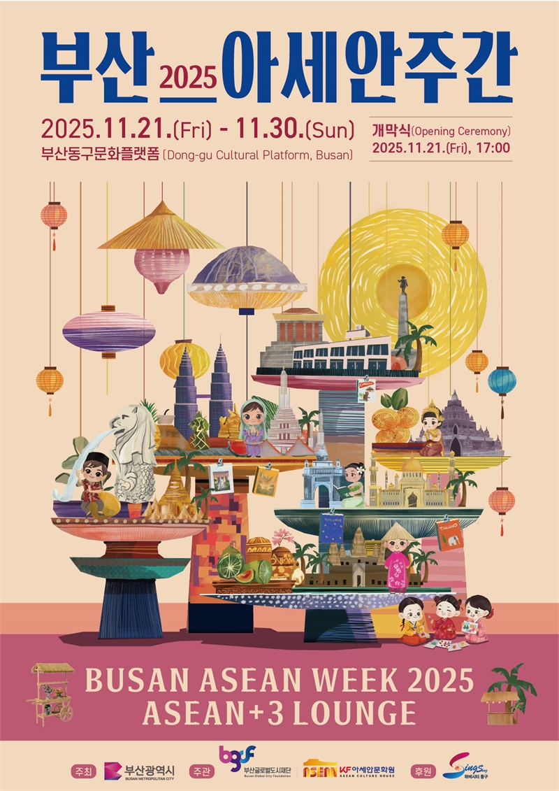 [더코리아저널 김종섭 기자] 부산시(시장 박형준)는 21일부터 11월 30일까지 열흘간 동구 문화플랫폼(도시철도 부산진역 8번 출구)에서 「2025 부산-아세안 주간」을 개최한다.「부산-아세안 주간」은 시민, 아세안 외교 사절단, 유학생, 아세안 진출 기업 등이 참여하는 국제 문화교류 행사다. 2019년 한-아세안 특별