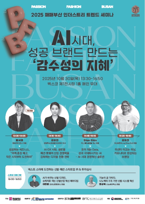 [더코리아저널 김종섭 기자] 오는 30일 부산 벡스코 제1전시장 메인무대에서 '2025 패패부산 인더스트리 트렌드 세미나'가 개최된다.올해 주제는 'AI 시대, 성공 브랜드 만드는 감수성의 지혜'다. 이번 행사는 효율성 중심의 기술 혁신을 넘어, 인간 중심의 창의성과 공감의 가치를 재조명한다. 부산광역시가 주최하고 부산테