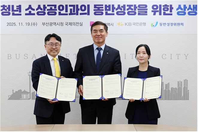 [더코리아저널 김종섭 기자] 부산시(시장 박형준)는 부산 지역 청년 소상공인과의 동반성장을 위해 케이비(KB)국민은행-동반성장위원회와 19일 오후 2시 20분 시청 국제의전실에서 상생협약을 체결했다.협약식에는 ▲김봉철 시 디지털경제실장 ▲이준호 케이비(KB)국민은행 모바일사업본부 상무 ▲제갈현실 동반성장위원회 동반성장지원