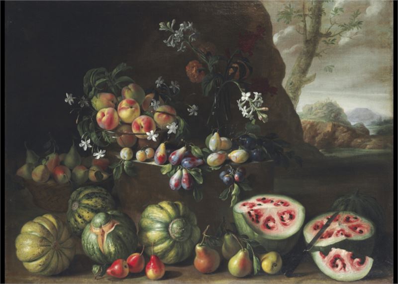 Watermelons, Peaches, Pears and Other Fruit in a Landscape, Oil on Canvas, 1620~1672, Giovanni Stanchi