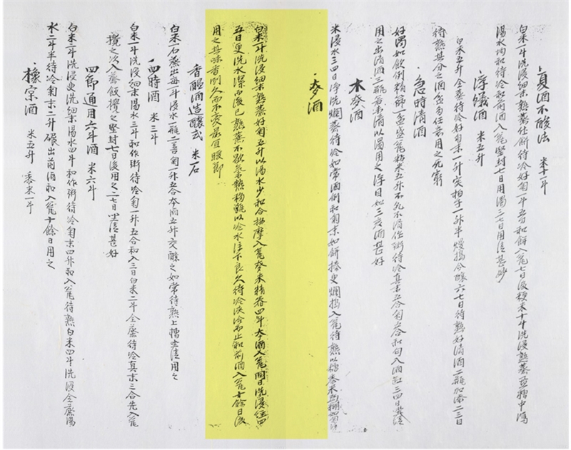 經四五日, 更洗水潔而後已, 熟蒸, 不歇氣熱, 移甑, 以冷水注下, 良久, 待冷. 浹冷而止和前酒入瓮, 十餘日後, 用之. 其味香, 例久而不變, 最宜暖節.
