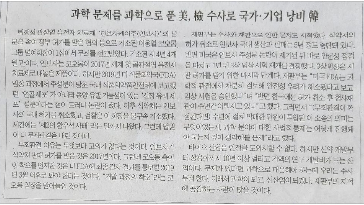 인보사 문제가 무죄로 판결이 났단다. 만시지탄이지만 다행이다.
