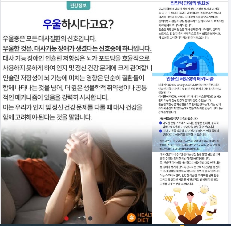 결국, 가상염증이 ‘우울증(정신적 신호)’ 과 당뇨병(신체적 신호)을 유발하는 공통적인 원인이라는 것입니다. 미토콘드리아 기능 이상은 이 과정에서 발생하는 결과 중 하나로 볼 수 있습니다.