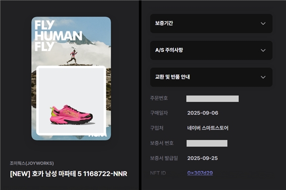 이번에 트레일 러닝의 명품으로 이름난 ‘호카’에서 트레일 러닝화를 구매하면서 ‘NFT 보증서’를 발급받았다. 2024년에 동일 브랜드에서 러닝화를 구매할 때 제공되었던 간단한 태그 형태의 보증서나 귀찮은 영수증과 달리 제조사의 혁신이 느껴진다.